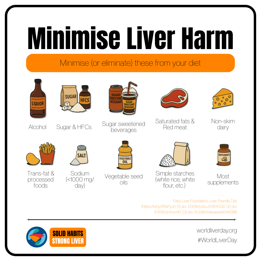 Limit saturated fats, trans fats, and added sugars: these are linked to liver disease, in addition to obesity and heart disease.