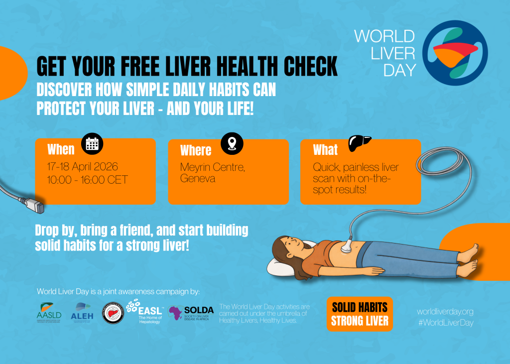 Join us for World Liver Day at Meyrin Centre in Geneva on 17 and 18 April from 10 a.m. to 4 p.m.! Get a free, quick, and painless liver health check — with results on the spot. Discover simple daily habits that protect your liver and boost your wellbeing. Drop by, bring a friend, and start building a stronger, healthier life.